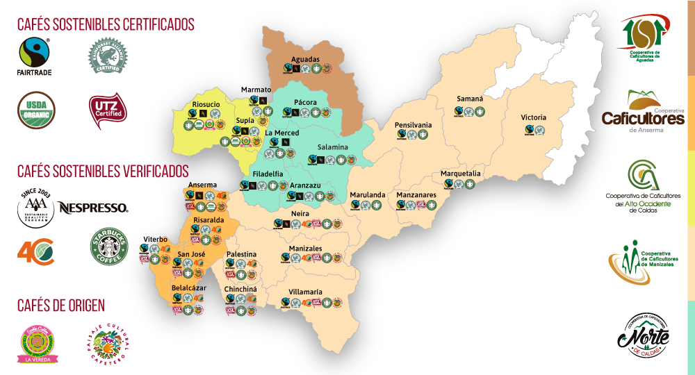 Hoy con el esfuerzo de los productores y de la Institucionalidad Cafetera, en los 25 municipios cafeteros de Caldas se producen cafés Sostenibles Certificados, Sostenibles Verificados y de Origen, que promueven condiciones de producción sostenibles y le muestran al mundo la variedad y riqueza de los cafés de Caldas.