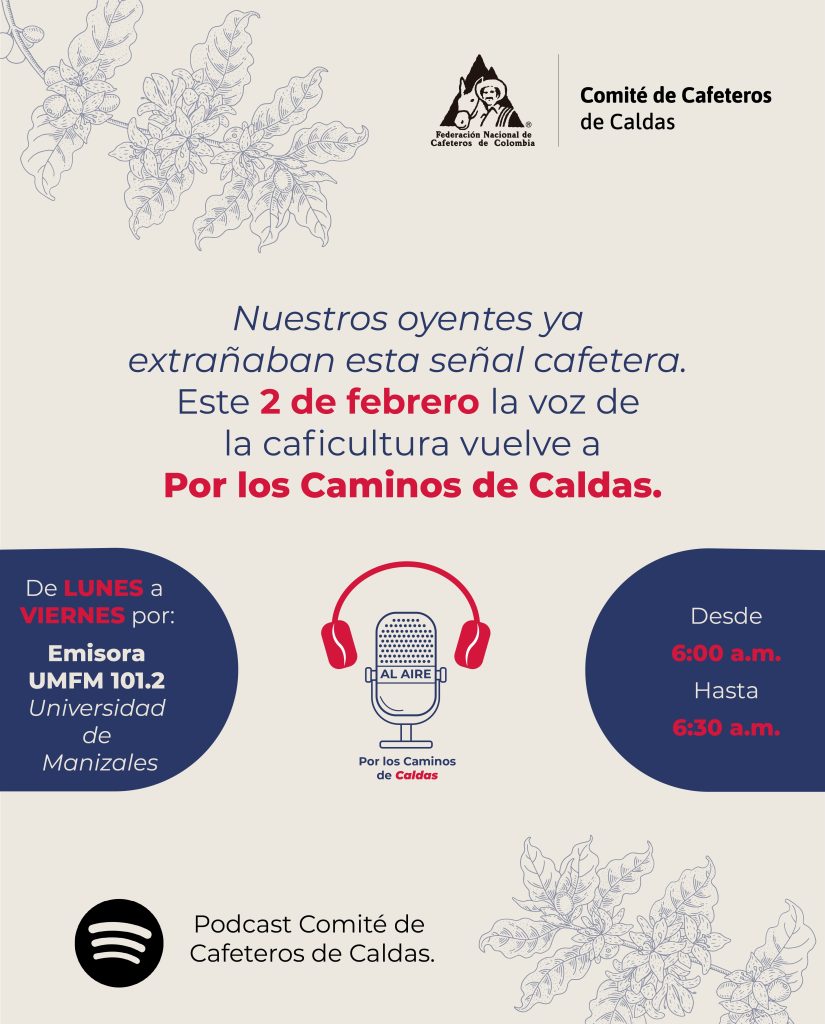 El tradicional programa radial del Comité de Cafeteros de Caldas, Por los Caminos de Caldas, anuncia con entusiasmo su regreso a las emisiones radiales en este 2026. A partir del próximo lunes 2 de febrero, el espacio volverá a acompañar a las familias cafeteras del departamento de lunes a viernes, de 6:00 a.m. a 6:30 a.m., a través de la emisora de la Universidad de Manizales de la frecuencia 101.2 FM.