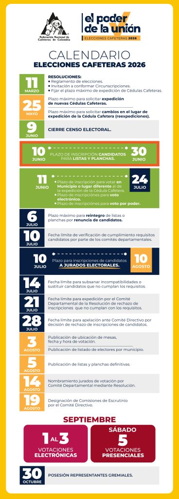 Más de 500 mil caficultores podrán votar en septiembre de 2026. Los productores federados podrán ejercer su derecho al voto entre el 5 y 6 de septiembre de 2026 de manera presencial, o entre el 1 y 3 de septiembre a través de voto electrónico, un mecanismo voluntario que busca facilitar la participación desde cualquier territorio.
